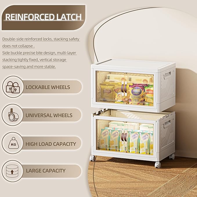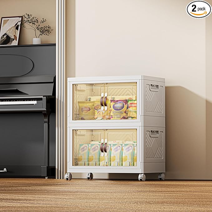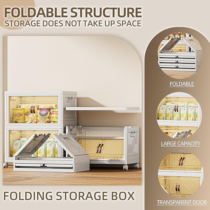 168 QT / 42 Gal Magnetic Door Storage Bins Collapsible Stackable w/1 Lid, Heavy Duty Plastic Cabinet with Wheels for Home Office Organization (White)