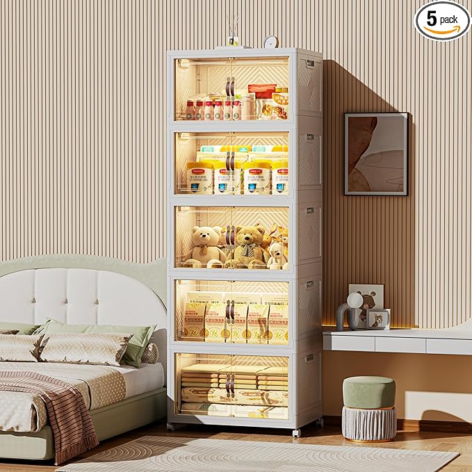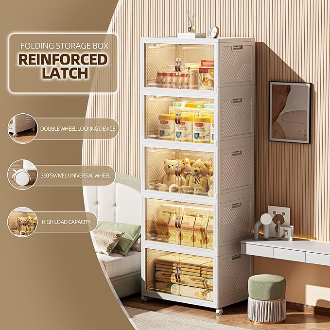 520 QT / 130 Gal Stackable Collapsible Storage Bins with Magnetic Doors & Wheels - Space-Saving Plastic Organizer Cabinet for Closet, Office, Home (White)