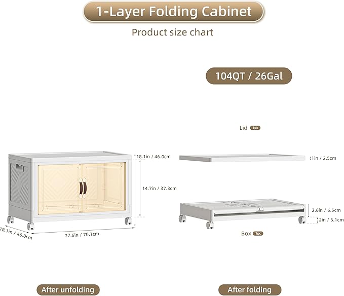 - Efficient Space Tidying: This stackable storage bin size is 18.1 x 27.6 x 18.1 inches. Includes 1 organiser box with wheels and 1 top cover to prevent dust intrusion. The current item option is 1 tier. This stackable storage bin has a maximum capacity of 104 QT (26 Gal). The single-tier organiser is flexible enough to slide under a bed or table.