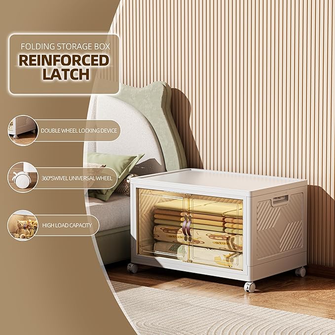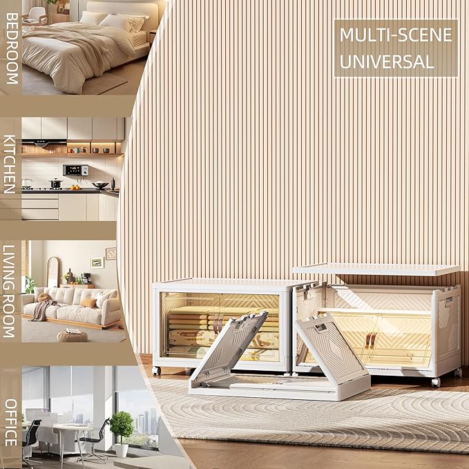 104 QT / 26 Gal Stackable Collapsible Storage Bins with Magnetic Doors & Wheels - Space-Saving Plastic Organizer Cabinet for Closet, Office, Home (White)