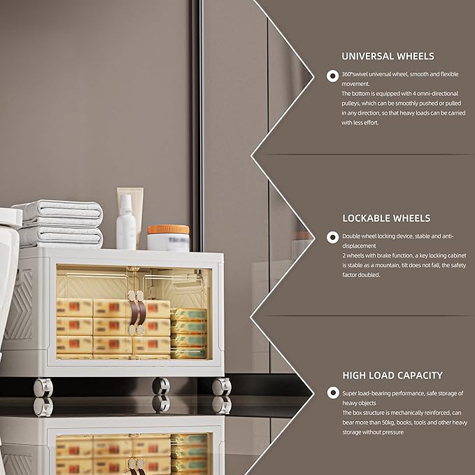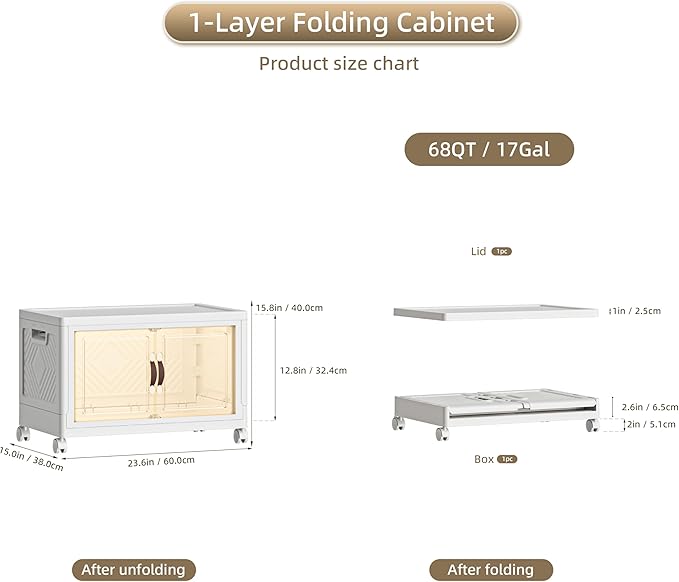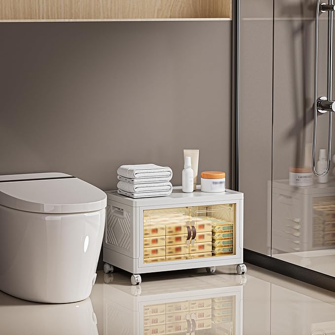 68 QT / 17 Gal White Storage Bins with 1 Lid - Collapsible Stackable Cabinet Organizer w/Wheels & Magnetic Doors, Plastic Storage Box for Office Closet Organization