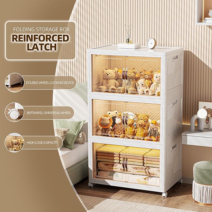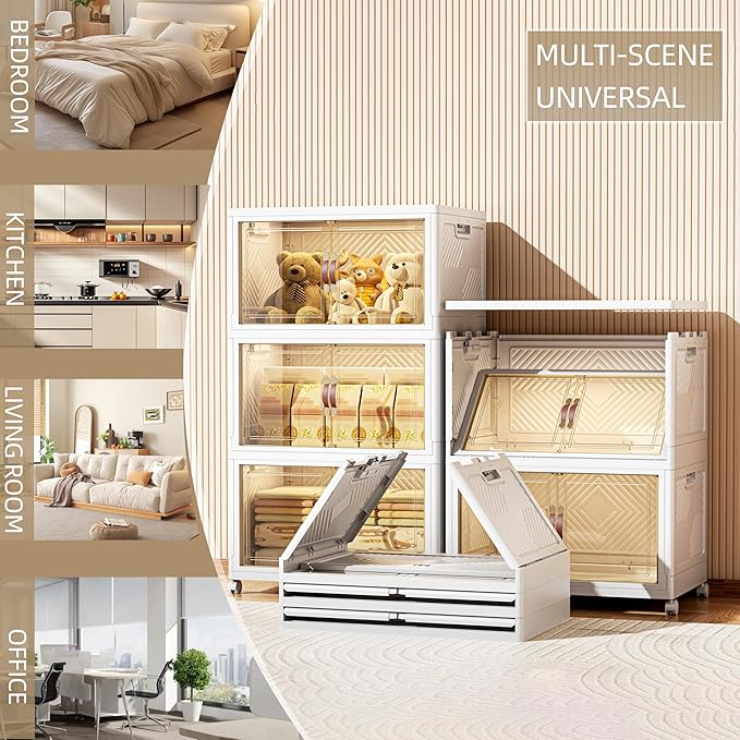 312 QT / 78 Gal Stackable Collapsible Storage Bins with Magnetic Doors & Wheels - Space-Saving Plastic Organizer Cabinet for Closet, Office, Home (White)