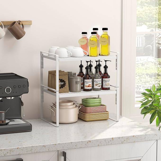 - 【Versatile Storage Shelves】These stackable shelves organizer can be used in more than just the kitchen! 2 tier design allows you to make better use any limited counter space, perfect for the kitchen, pantry, cupboard, closet, bathroom, coffee station, vanity, office. Find what you need at a glance! With the help of this kitchen shelf, you can save a lot of space and make your space clean and neat.