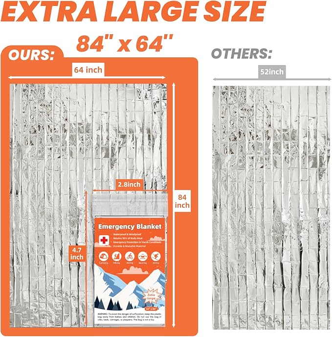 - LIGHTWEIGHT AND COMPACT: The blanket is designed to be ultra-light and compact, measuring 84” x 64” when unfolded and 4.7” x 2.8” when folded. It is easy to carry and fits perfectly into emergency kits, backpacks, or survival gear, taking up minimal space and adding negligible weight.
