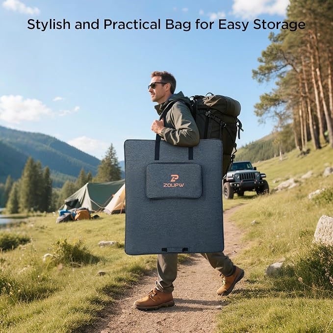- 【Camping Essentials You Must Have】Weighing only 22.05 lbs,this fiberglass-reinforced 350 watt solar panel delivers rugged, portable power for charging power stations.Includes a premium compact bag for easy transport. Adventure-ready durability meets hassle-free setup—perfect for stress-free camping. Stay charged,explore freely.