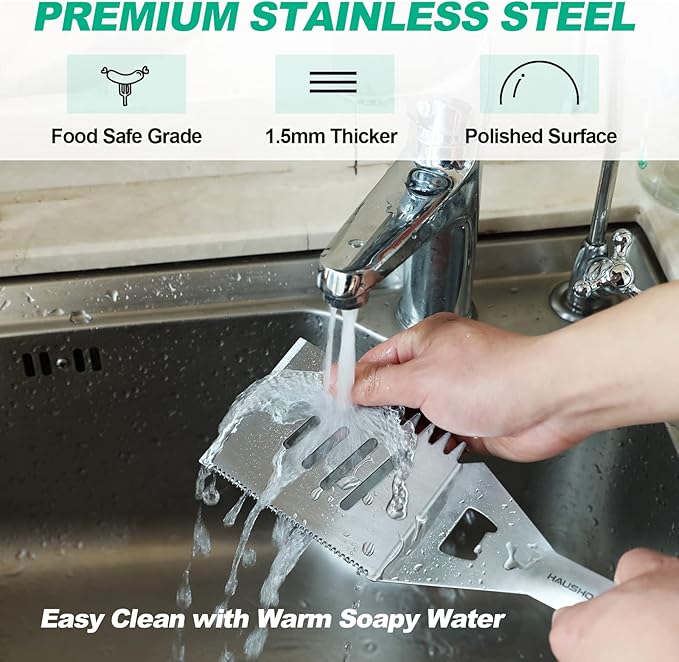 - 4-IN-1 Spatula: Drain Excess Grease; Cut meat; Air Hole Creator; bottle opener. The large Spatula in these BBQ accessories can satisfy various needs.