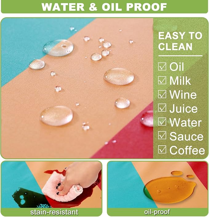 - Oil and Water Proof: Crafted from high-quality polyester, ensures no spills or stains soak in and easy to clean - just wipe it down with a damp cloth, and it's good as new. The material is also colorfast, wrinkle resistant and wear resistant, and whether used indoors or outdoors, this tablecloth will ensure that your table will still look vibrant after multiple uses