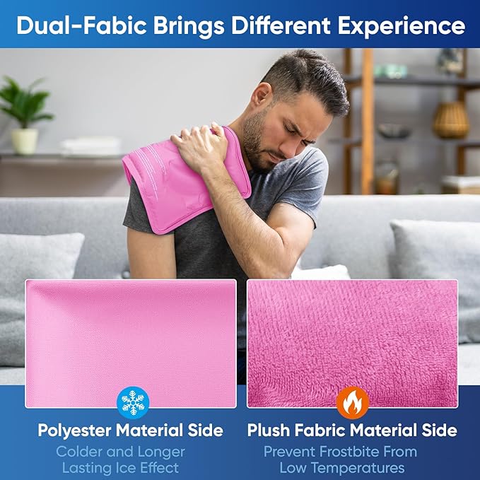 - Double-Sided Material: The gel ice packs reusable feature two-sided materials, one side is made of polyester for a stronger and longer-lasting cooling effect, while the other side is soft plush fabric, which prevents frostbite and enhances comfort during cold therapy