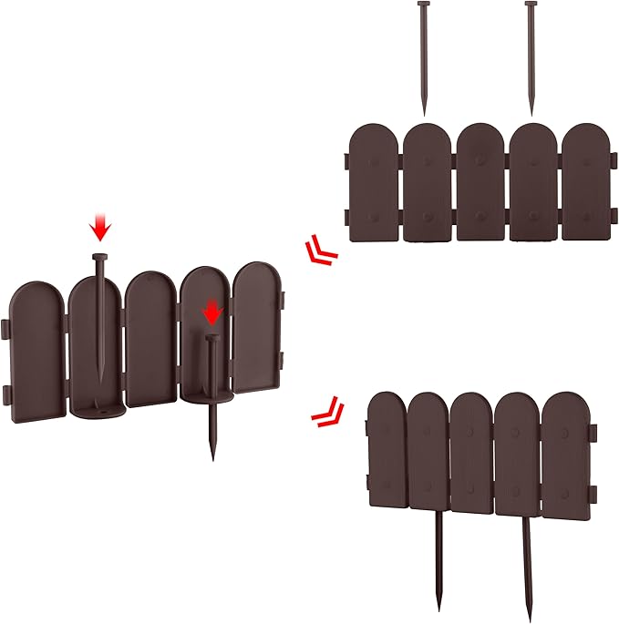 - 🌹 Easy Installation and Flexible Design: To install, simply insert the spikes at the bottom of each panel and push it into the desired position. Easily link panels at the ends to create a straight edge, or turn them 90 degrees to form corners. For tough or hard soil, use a soft-faced hammer for easier installation. Available in brown, green, timber, and white colors to complement your garden's style.