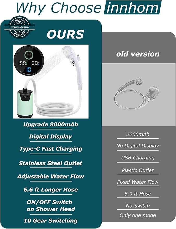 - Rechargeable 8000mAh Battery & 180 Minutes Runtime: innhom portable shower for camping equipped with a 8000mAh battery capacity and can work continuously up to 180 minutes on a full charge in 3-4 hours. Our camping shower features a Type-C port, it supports multiple charging methods, which can be charged with cell phone adapter (5V-2A), power banks, laptop, car USB output. Plus, the waterproof silicone cover enhances safety for outdoor adventures.