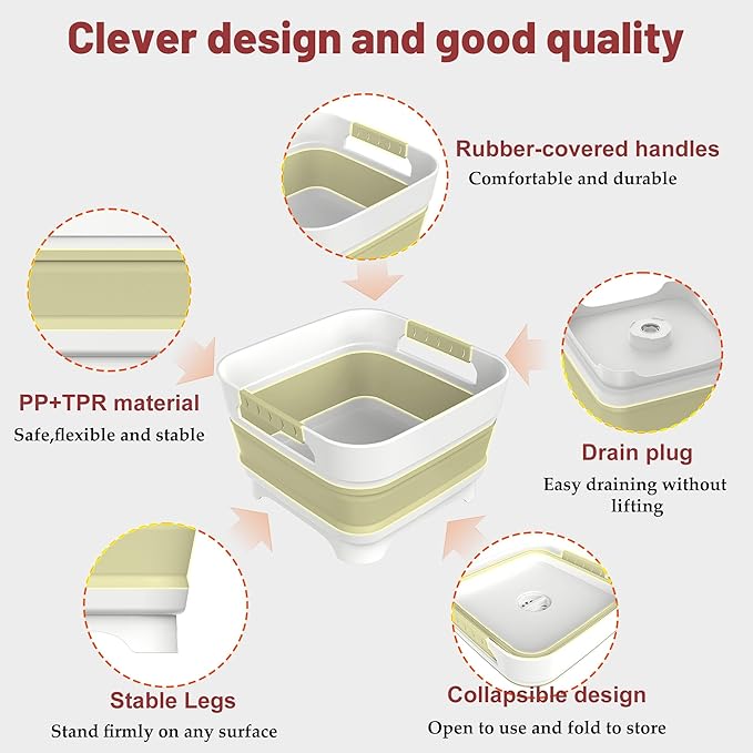 - 【Improved Design】: Our upgraded collapsible dish tub now features rubber-covered handles for a more comfortable grip and increased durability. This collapsible dish drainer is perfect for washing dishes, bowls, vegetables, and pump parts.