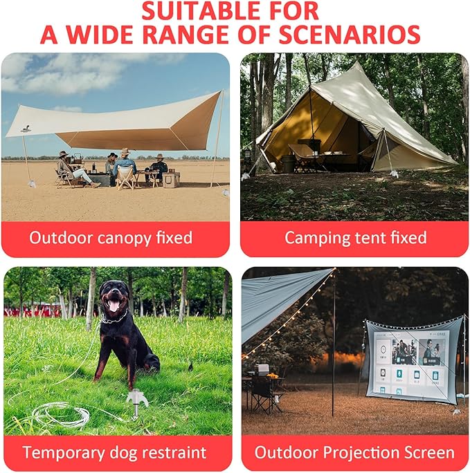 - 【Versatile Applications】These stakes are not only suitable for camping equipment like tents, canopies, and sunshades but can also be used to secure dog leashes, Christmas decorations, garden decorations, and more. They perform exceptionally well in windy conditions, making them perfect for outdoor travel, patios, gardens, and other occasions.