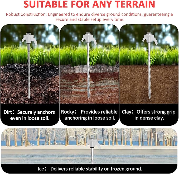 - 【Efficient and Convenient】By using a cordless drill or impact driver, the tent stakes can be quickly screwed into the ground, saving setup time. They are suitable for securing various outdoor equipment such as tents, canopies, sunshades, and guy lines. The spiral design provides stronger grip, making them ideal for grass, hard soil, gravel, and other surfaces.