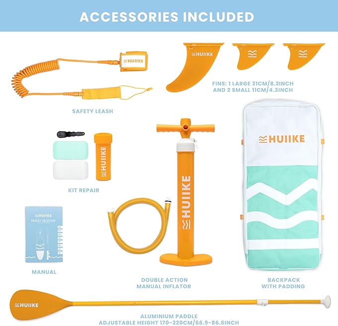 - All the accessories you need - The “Enjoyer - Essential” collection include everything necessary to practise paddleboarding: green stand up paddle board, backpack, safety leash, pump, aluminum paddle, 3 fins, repair kit and manual