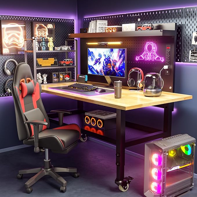 60" Heavy Duty Adjustable Workbench with Large Pegboard& Partition, Adjustable Work Table with Power Outlets & Lockable Wheels, Rubber Wood Workstation for Garage, Workshop, Office, Home, Commercial