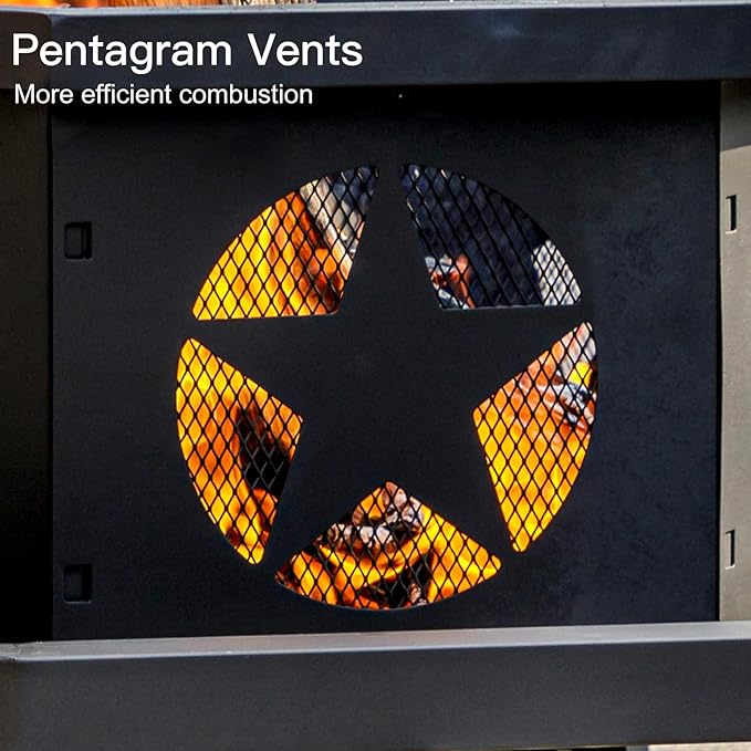 - [Enough Heat] Panovue firepit has vents on fire pit's sides and ridges on bottom of fire pit which can help elevate firewood for better air flow underneath fire, resulting in more efficient combustion and a larger, brighter flame. The octagonal design of wood fire pits can accommodate 3-6 people for heating, and each angle is warm enough.