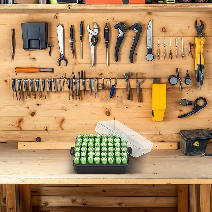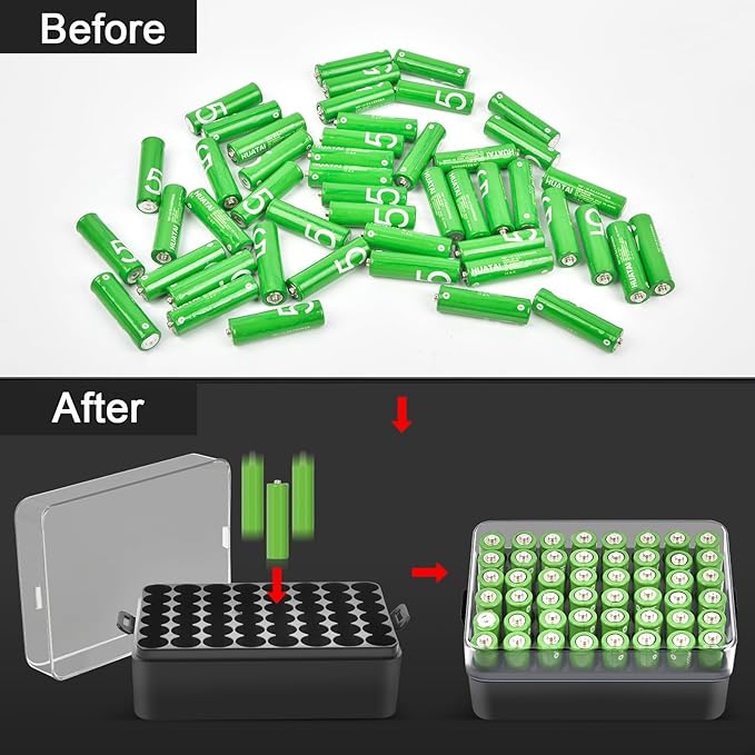 - Custom-tailored, Maximizing Space Utilization:Battery organizer is specifically designed for AA batteries, featuring 48 precisely fitted slots. Battery holder organizer fits for Amazon Basics/ for DURACELL/ for Energizer/ for powermax/ for Voniko brands batteries. Each battery slot is meticulously crafted to ensure that batteries fit snugly without wobbling or getting stuck. Transparent lid design allows you to easily see quantity of batteries inside. AA battery case size: 5.5*3.75*2.25 inches.