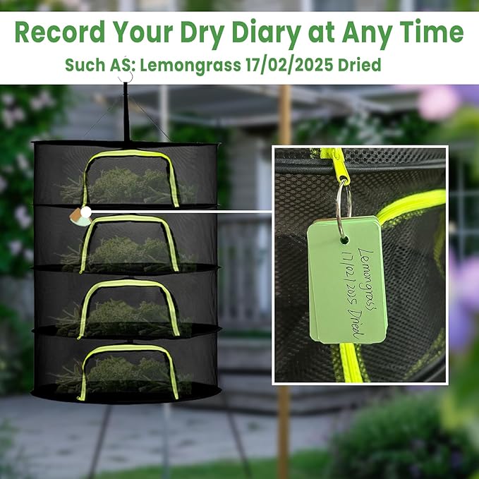 - 【Professional Herb Drying Rack Hanging Kit】In addition to the herb dryer hanging rack, this kit includes a sharp garden scissors, that helps you trim plants faster and more accurately. A hook will help you hang the drying net more quikly. A drying dailybook will help you record the drying log on the net. Use this herb garden indoor outdoor kits to meet your drying, trimming and recording needs.