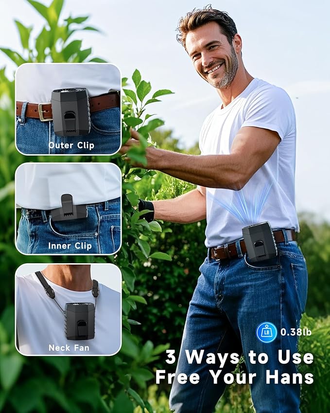 - 【Hands-Free 4-in-1 Cooling Solution】 Stay cool anywhere with this versatile 4-in-1 personal fan! It works as a waist fan, neck fan (with the included lanyard), desk fan, and handheld fan—all in one compact design.Designed for extreme heat, this wearable fan provides powerful, hands-free cooling whether you're indoors or outdoors.