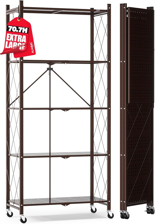 ALANNG 70.7" H Metal Storage Shelves, 5 Tier Folding Shelf on Wheels, Heavy Duty, No Assembly, Rolling, Collapsible Rack Unit for Kitchen, Basement, Pantry (Vintage Brown,1 Pack)