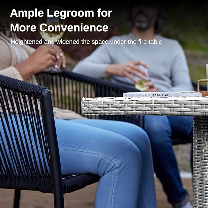 - Ample Legroom for Added Convenience: Our designer especially heightened and widened the space under the fire table, so that there is enough legroom when sitting next to it, which is more convenient than other 44'' fire tables on the market. As tabletop is made of one piece of tempered seamless glass, making it easy to clean