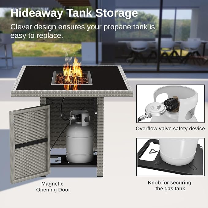 - No Worry About Rusting and Fading: 100% aluminum frame design (never rust), tempered glass table top, 304 stainless steel burner, and UV-protected rattan covering, all protect the outdoor fire table effectively from cracking or discoloration. Keep the lid on when not in use to prevent rain from entering the body. Multiple weather-resistant designs make it long-lasting