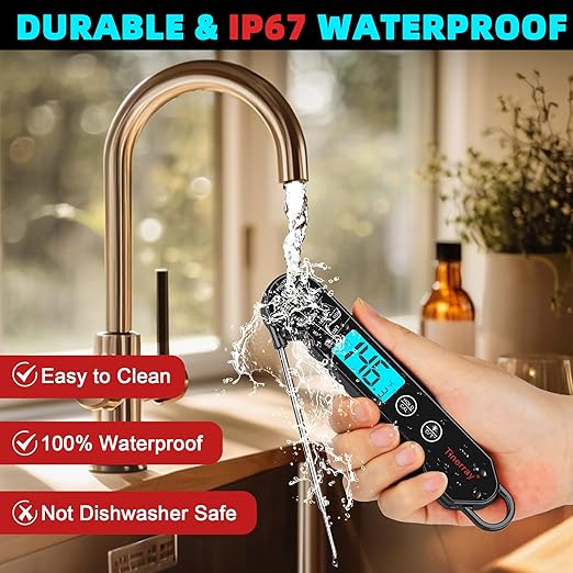 - 【Waterproof & Easy to Clean 】 Rated IP67 waterproof, this digital meat thermometer can be safely rinsed under running water for effortless cleaning. (Note: Do not soak or submerge in water.) Built with durable ABS plastic, it withstands accidental drops