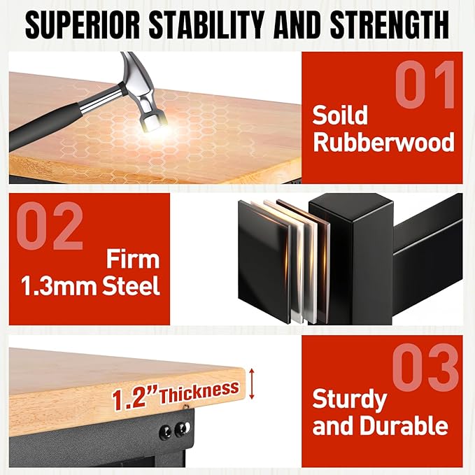 - EASY TO ASSEMBLE: Comes with installation instructions with all required accessories. There are pre-drilled holes on the back of the board to help you install the workbench easily in 10 minutes. This work bench is not only suitable for garage or workshop, but also can be used as office table, home table and store table and so on. Please contact us first if you have any questions. We will do our best to serve you.