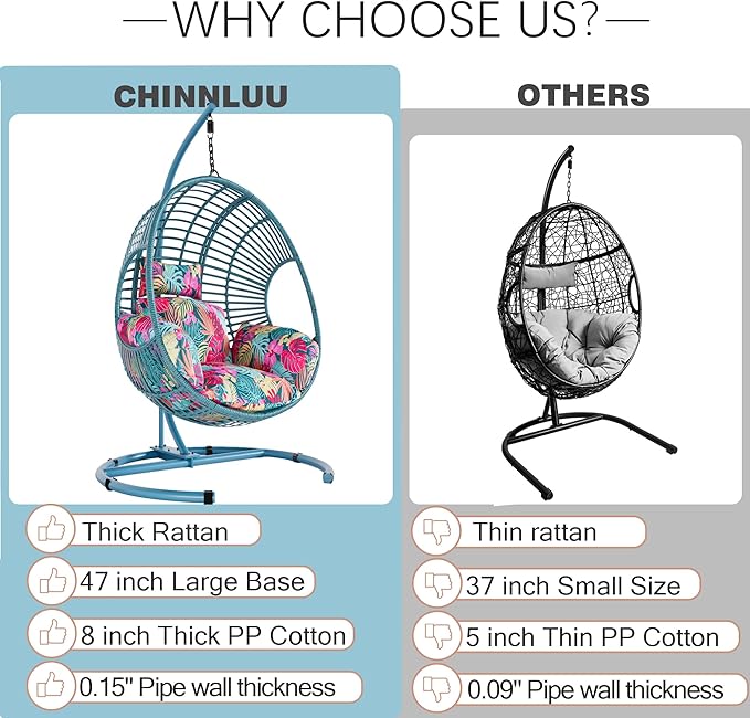 - Not Just for Outdoors – CHINNLUU egg chairs are truly modern additions for indoors/ outdoors like garden, porch, patio, pool, etc., and they also inject a laid-back bohemian feel to your living room and bedroom.