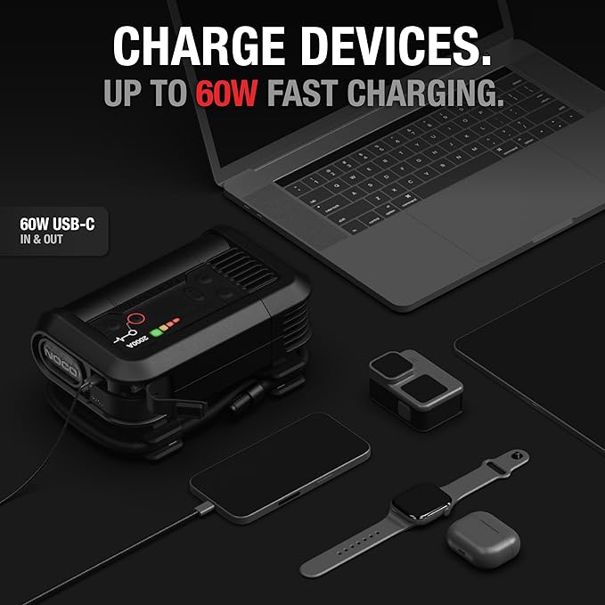 - LITHIUM POWERED — More than a jump starter, it's a cordless lithium-powered air pump that inflates up to 2.5 tires (0-40 PSI) or tops off 20 low tires (35-40 PSI) on a single charge. And it recharges in just 48 minutes from any 60W USB-C powered port.