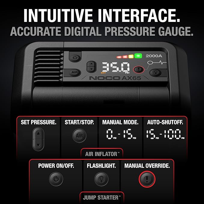 - ALL-NEW AX65 — A powerful all-in-one jump starter, ultra-fast tire inflator, power bank, and LED flashlight - built for total roadside independence. Delivers 2000 amps, rapid inflation, USB-C charging, and lighting when you need it most.