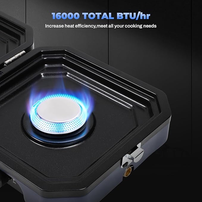 - DUAL BURNER DESIGN: The portable gas stove features a dual burner setup with two adjustable burners that allow you to cook up to 2 pans or pots up to 10 inches in diameter at the same time, providing versatility in your camping kitchen