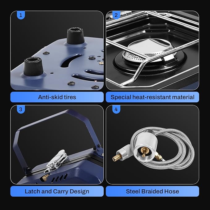 - DURABLE CONSTRUCTION: The folding camping stove is made of heat-resistant steel body to ensure sturdiness and durability; the surface of the stove and grill pan, are made of non-stick coating material, which is rust-resistant and non-stick. The propane stove is compatible with most propane bottles; we also use non-slip grates, as well as a snap-on design that won't move easily during use, providing excellent rust resistance and durability