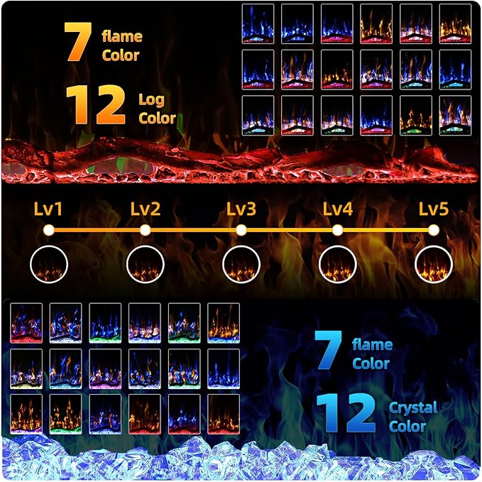 - πβ Personalized Ambiance, Lifelike Flames: Enhance your home with our deluxe electronic fireplace, offering lifelike flames that capture the essence of a real fire. Select from 5 flame brightness settings, 12 carbon bed colors, and 7 flame hues to craft your ideal ambiance.Customize your look with a large log, various decore log and crystal options, seamlessly fitting any style, whether modern or rustic. Experience comfort and charm in one beautiful package!