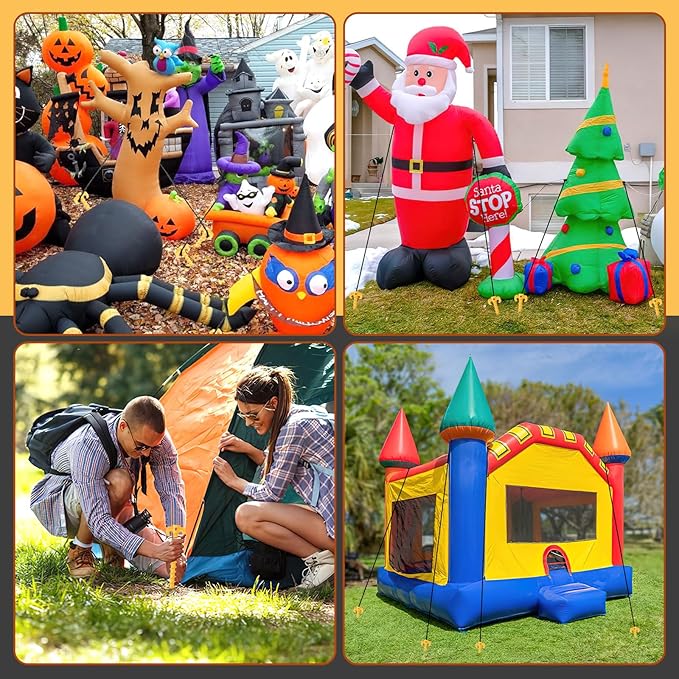 - Easy to Use: These tent stakes heavy duty have a long, pointed head and a spiral shape, which can be easily screwed into hard, dry soil and sand. Just insert plastic stakes into the soil, adjust screw in tent stakes to the angle you need, tie one end of the rope to the pile, and then tie the other end of the rope to the inflatables, which is very convenient to use