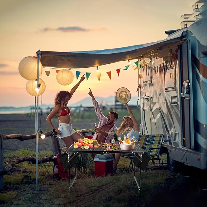 - 3 Height Options, Outdoor/Indoor use - At a height of 21.6 inch, you can use it with a picnic or beach mat or rug as a floor table, and when adjusted to 24.6/27.6 inches, you can use it with a picnic or fishing chair. This folding table is very suitable for 3-5 person, couple and family to use in most daily occasions and outdoor activities. It can be used as outdoor bbq table, grill stand, picnic table, dining table, beach coffee table, game table, fishing table, rv table, card table and side table