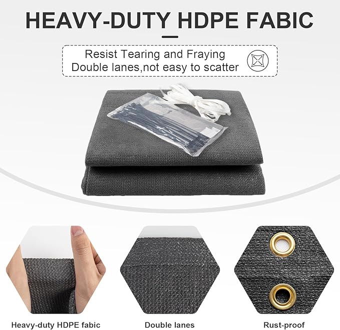 - ?�Easy to Install?‘Each shade cloth for patio is designed with heavy-duty copper grommets at 2 ft intervals, with included zip ties, ropes, and offers flexible mounting options. Please understand that due to the elasticity of the material, our shade cloth has a tolerance of ±2 inch.