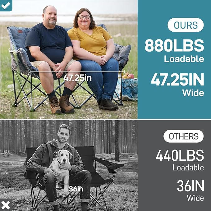 - 【OVersized Double Camping Chair】Designed with extra long and wide seat surface, suitable for family usage, this camping loveseat can bring you and your family or friends a pleasant relaxing experience. With the high backrest of the 2 person camping chair and the thick padded cushion, this folding sofa is especially comfortable and keep you cozy all the time.