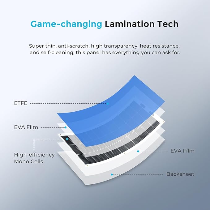 - [Super Thin Lamination] Hardly noticeable, the 100W solar panel flexible is only a tenth of an inch tall, approximately 95% thinner than its rigid counterpart. This makes it perfect for a stealthy solar setup.