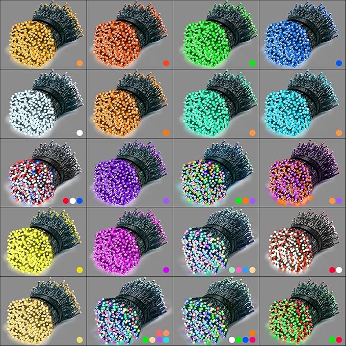 - 35 Colors Changing Christmas Lights: 164ft 500 LED RGB string lights green wire with 17 base colors + 18 holiday themes colors ( “W” button for cool white color / “WW” button for warm white color ), dynamic effects, timer settings and remote control. Ideal for festive decor and ambient lighting. The green wire is natural and rustic, blending seamlessly with courtyard plants and Christmas trees