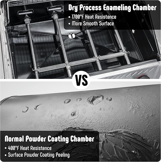 - Porcelain-Enamel Cast Iron Grates:This 4-burner propane grill features porcelain-enamel cast iron grates for high-temperature resistance, rust prevention, and even heat distribution. The non-stick surface reduces food sticking, making cleanup easier