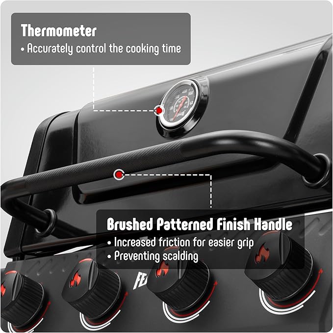 - User-Friendly Design: This gas grill equipped with 2 side tables for extra cooking space, a propane tank holder, 3 tool hooks, non-slip handles, and a built-in thermometer for accurate control. The movable wheels make it easy to transport