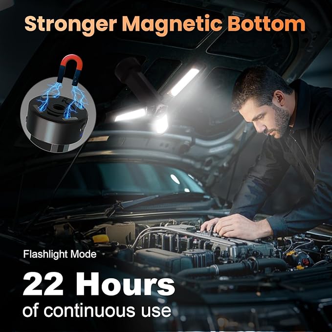 - [Suitable for Multiple Scenarios] -- This led work light with stand features a magnetic bottom and a folding hook, allowing it to be used as a stand light, pendant light, table lamp, or flashlight. Its versatile design makes it perfect for outdoor camping, indoor work, auto repair, workshops, job sites, or even as a thoughtful mechanic gift. A reliable lighting solution for any situation.
