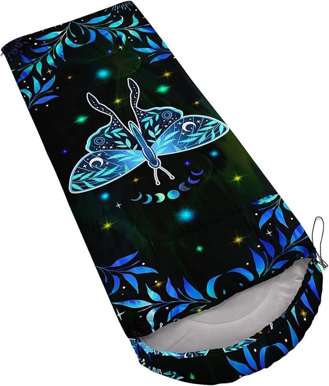 - Unique Moth Design:This Moth pattern sleeping bag is made of 3D digital printing with vibrant colors and patterns,size: 31W x 90L inches,temperature range: 32℉-77℉ (0℃-25℃),it also also have a weather resistant waterproof design to keep you warm and prevent you from any dampness,can be used in 3 seasons