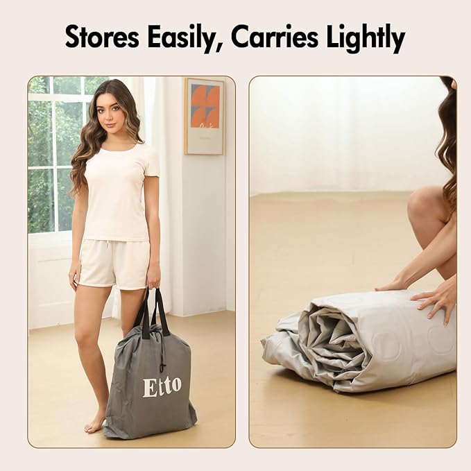 - Versatile & Travel-Ready. Whether you're hosting overnight guests, visiting family, or heading out on a camping trip, the Etto air mattress is your go-to portable comfort solution. Weighing just 14 lbs and packed in a convenient storage bag, it’s easy to take anywhere and simple to store when not in use