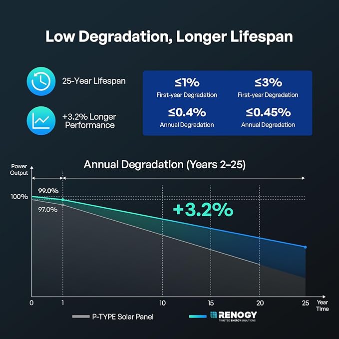 - 【Long-Term Reliability】Renogy 175w solar panel with low degradation (≤1% in the first year, ≤0.4% annually) , plus a 25-year 80% output for lasting performance.