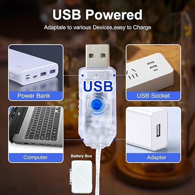 - USB & Battery Dual Powered String Lights: 2 power supply methods are suitable for any scene and location; No more worrying about power outlet or changing batteries frequently; Use USB plugs indoors to achieve optimal lighting effects; Outdoors or in places without sockets, you can use batteries for power supply; Decorate your party with our string lights now (Note: USB power adapter and 3AA battery are not sold with the order)
