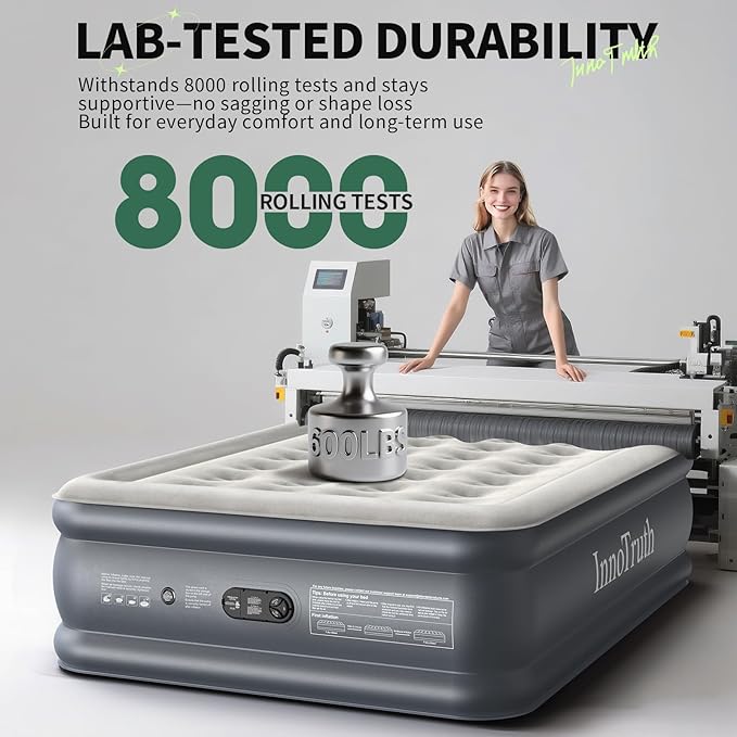 - ๐๐ง๐ซ๐ข๐ฏ๐๐ฅ๐๐ ๐๐จ๐ฆ๐๐จ๐ซ๐ญ: Enjoy quick, firm support with the InnoTruth air mattress, featuring a powerful 110V pump that inflates or deflates in just 3 minutes. The Smart Air Coil System conforms to your body's natural curves, evenly distrubuting weight to minimize sinking and relieve pressure on your back