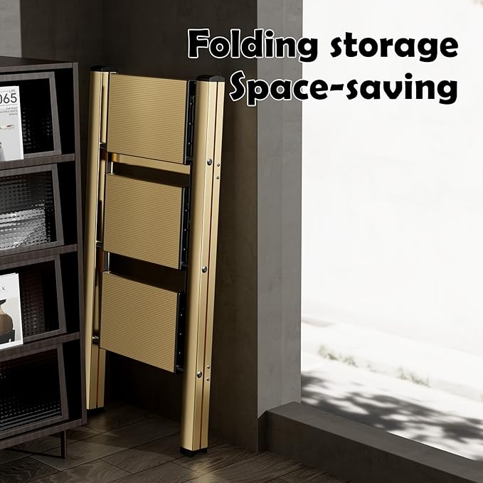 HillhutApex 3 Step Stool, Aluminum Foldable Step Ladder, Lightweight Stable Stool with Wide Non-Slip Pedals, 330lbs Bearing Capacity Ladder for Office,Home,Kitchen - Gold