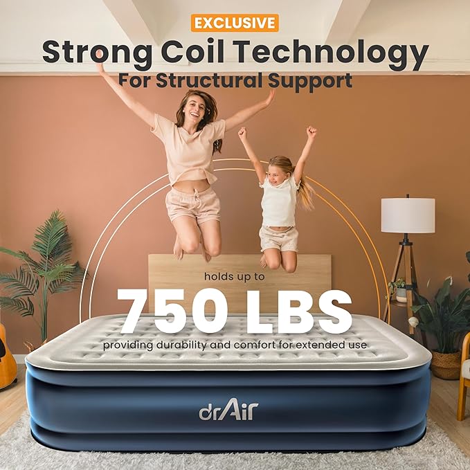 - 【UPGRADED BUILT-IN AIR PUMP】Dr. Air King-sized air mattress inflates 31% faster and 50% noise-reducing than similar products with an upgraded built-in electric pump, taking just 2-3 minutes. Its upgraded design offers quick, reliable performance while effectively minimizing leaks and 1-click inflation and deflation.(Compatible with 110V)